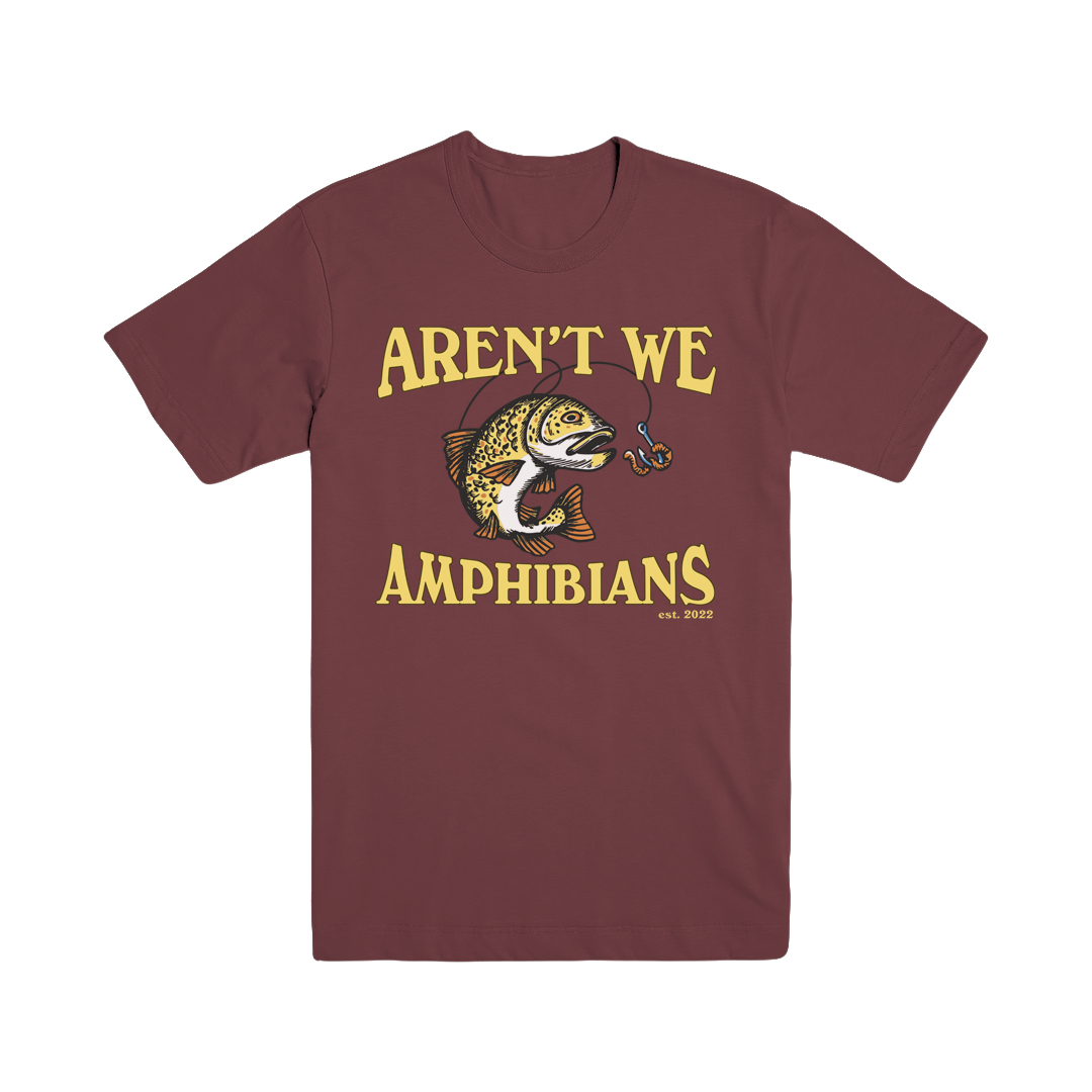 Aren't We Amphibians "Gone Fishing" exclusive design. Printed on 100% Cotton, 6.1 oz garment dyed Comfort Colors tee in Brick, celebrating and supporting the upcoming release of AWA's first full-length album on PNWK Records.